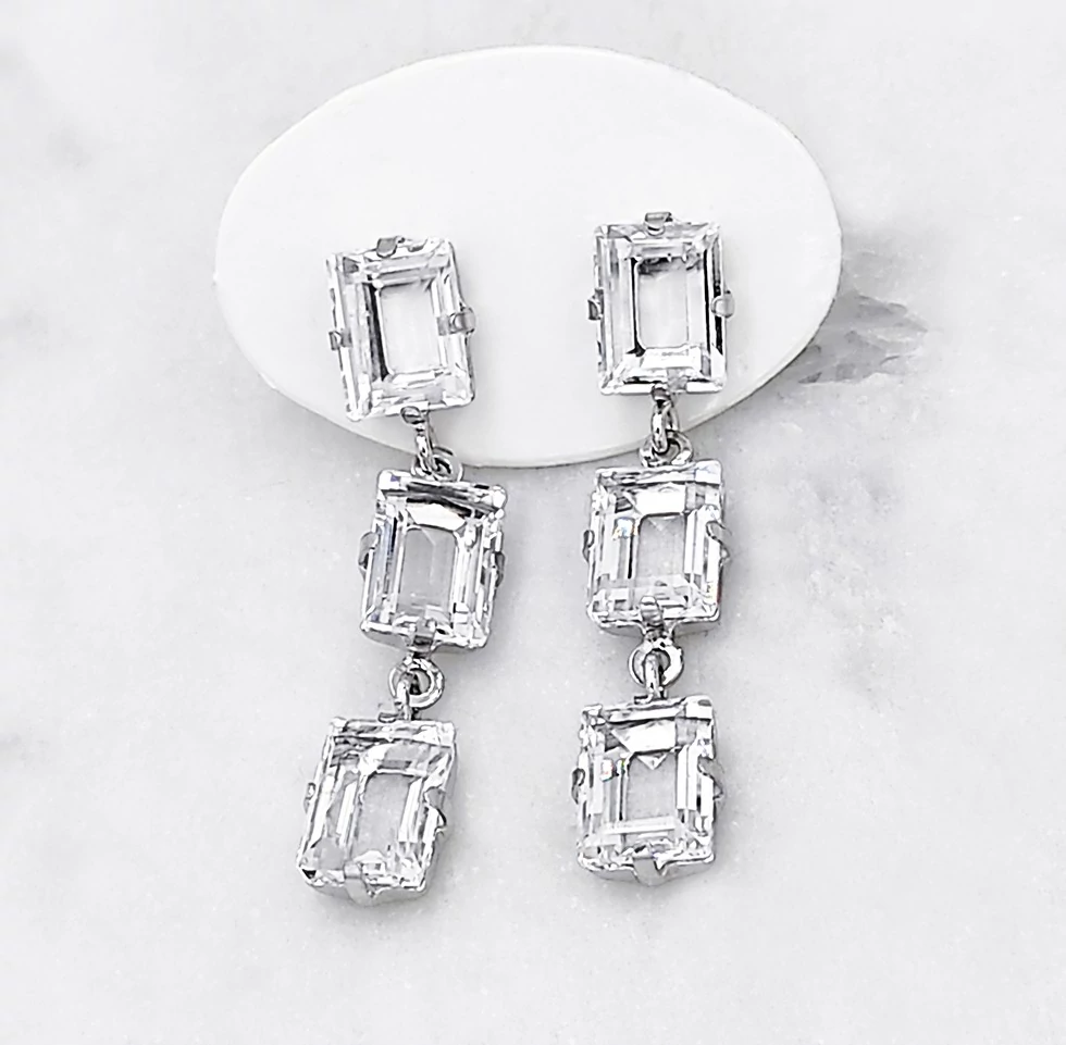 Ezüstből készített lógós fülbevaló, bagett csiszolású fehér swarovski kristályokkal foglalva.